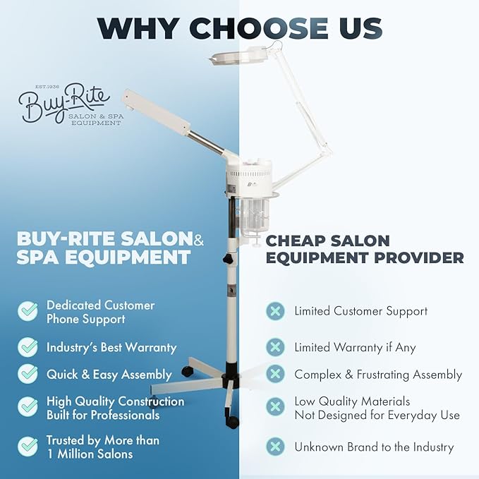 Buy-Rite 2-in-1 Marie Ozone Facial Steamer, 5 Diopter Magnifying Lamp, Fully Adjustable Height, 360' Swivel, Timer and Automatic Shut-Off, Large Star Base with Wheels, MEI-2001A