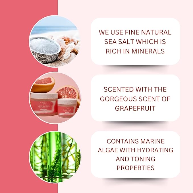 - NATURAL SEA SALT & MARINE ALGAE: Enriched with natural sea salt and marine algae oil, our unique formulation goes beyond exfoliation. The sea salt and marine algae contribute to improved hydration and overall skin condition. Users have reported anti-aging benefits, including a reduction in wrinkle depth, a more unified skin tone, and enhanced skin elasticity. Packed with essential nutrients, this salt scrub not only exfoliates but also moisturizes and nourishes your skin.