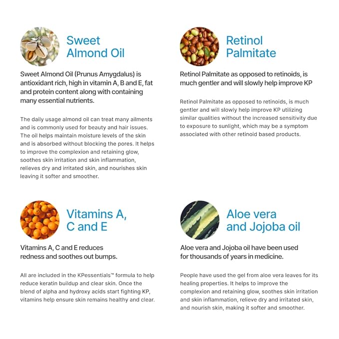 - RETINOL PALMITATE: As opposed to retinoids, Retinol Palmitate is much gentler and will slowly help improve KP utilizing similar qualities without the increased sensitivity due to exposure to sunlight, which may be a symptom associated with other retinoid based products.