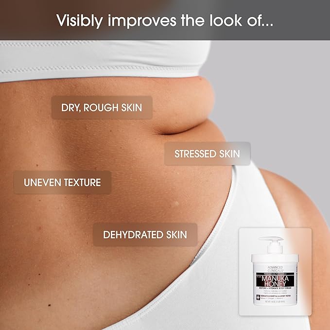 - MANUKA HONEY BODY CREAM NOURISHES & SOFTENS DRY, ROUGH SKIN โ This Manuka Honey + Collagen body cream provides hydration to soothe and replenish dry, textured skin. It promotes a softer, more comfortable complexion, leaving skin visibly renewed and nourished. Suitable body cream for women and men.