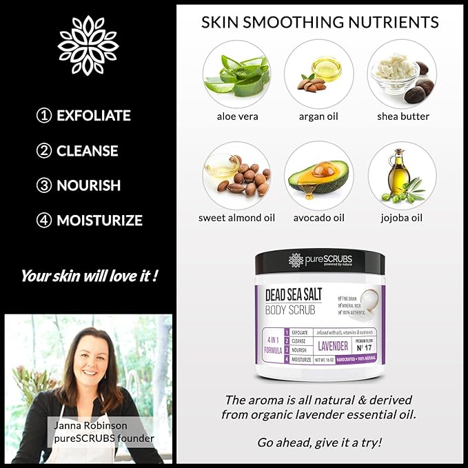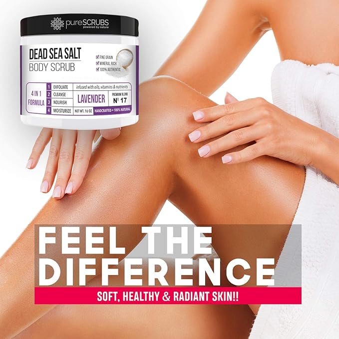 - GET ULTRA SMOOTH SKIN FAST - THIS WORKS! Our unique “4 in 1 Formula” does everything a body scrub should do and more - EXFOLIATE, CLEANSE, NOURISH & MOISTURIZE. Fine grain dead sea salt infused with essential oils, nutrients and skin softeners helps to smooth away rough, bumpy, and uneven textures to instantly reveal your true soft, healthy and radiant skin. You'll love the lavender aroma!