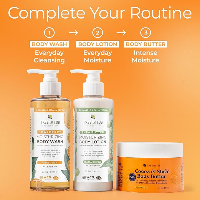 Tree to Tub Shea Body Butter for Dry, Extremely Dry, Sensitive Skin - Moisturizing Body Cream for Women & Men, Hydrating Body Lotion Moisturizer w/Vitamin C, Organic Cocoa, Citrus Scent