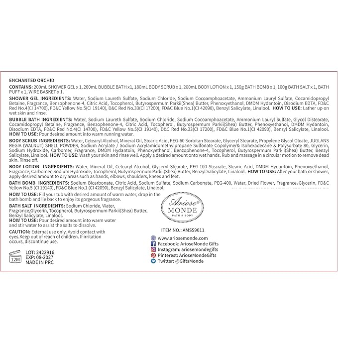 - 8 PCS COMPREHENSIVE SPA KIT: This elegantly packaged set includes everything needed for complete body and skin care, featuring orchid-shower gel, bubble bath, body scrub, bath bomb, bath salts, body lotion, and bath puff designed to nourish, hydrate, and revitalize from head to toe