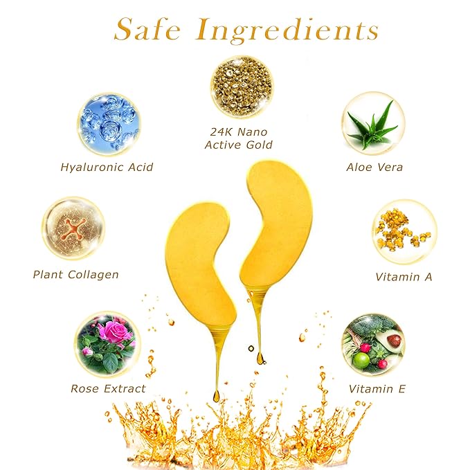 - โณ ANTI-AGING results of gel eye patches are achieved by hyaluronic acid and 24k gold extract that help to retain moisture in the epidermis, so it will not be dehydrated. Choose our gold eye patches eye mask skincare for puffy eyes for best results.
