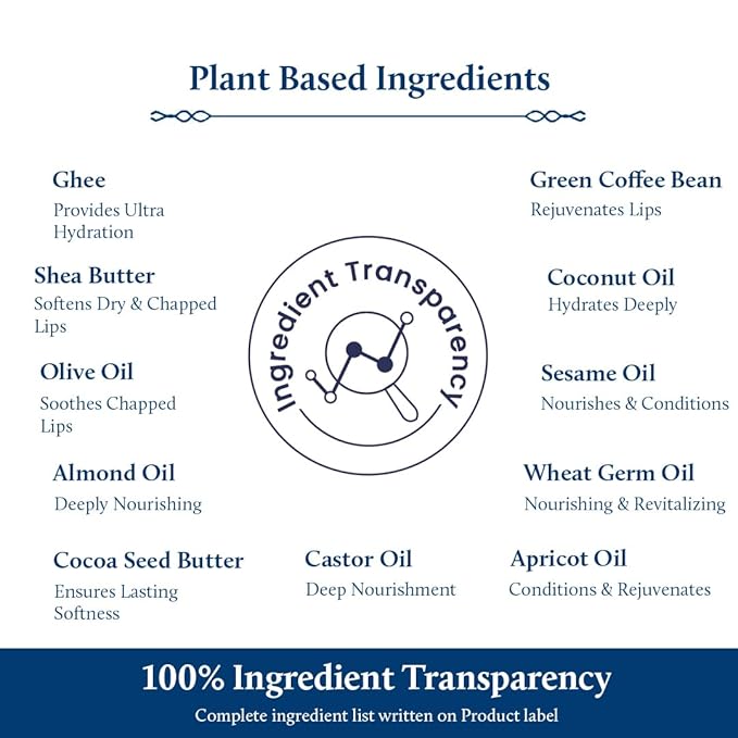 - DEEP HYDRATION for CHAPPED LIPS: Skin of the lip is thinner than the facial skin and tends to lose moisture quickly. The lip balm with Ghee and other natural oils like Coconut, Sesame, Castor and Almond Oil not only provide moisturization but also helps to seal and retain it. This fights dryness, chapped lips and gives Lip a healthy, supply, gloss and pout ready appearance