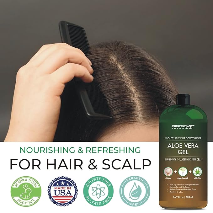 First Botany, Pure Aloe vera gel 100% Fresh Pure Aloe Infused with Stem Cells, Collagen Tea Tree Oil Natural Raw Moisturizer for Face Skin Body Hair Perfect for Sunburn, Acne, Razor Bumps 16.9 fl oz