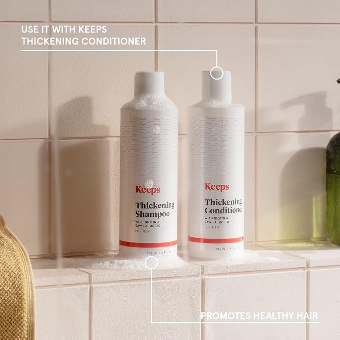 - Thickening Shampoo for Men: Better hair is just a rinse away with Keeps Thickening Shampoo. Our shampoo is formulated to make thinning hair look thicker and fuller. It also works great to complement and enhance results of male hair loss treatment. Includes one 8 oz bottle.