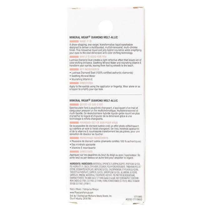- Skin-Loving Ingredients: This metallic eyeshadow includes real lustrous diamond dust to create a stunning gemstone finish. Add in the soothing mineral water and nourishing vitamin E for a skin-loving eyeshadow with dazzling effects.