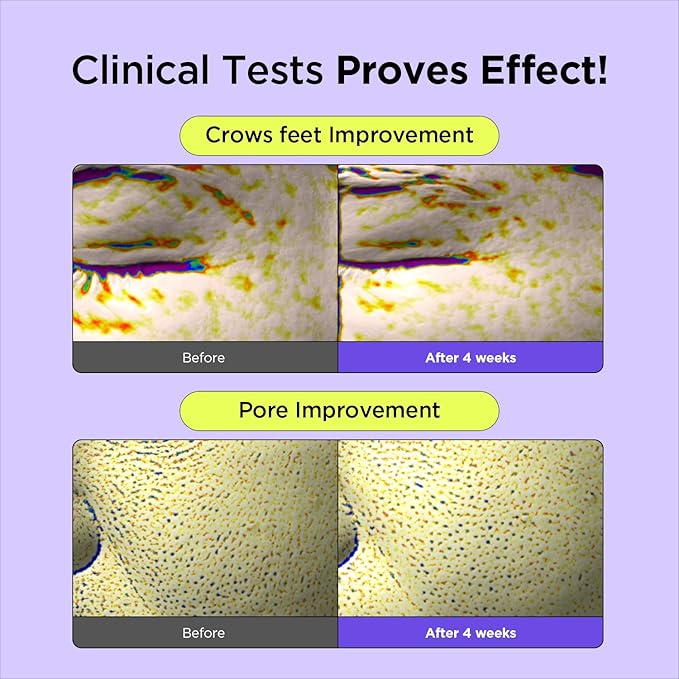 - 📊 NOTICEABLE RESULTS: ✅Immediate effect on quantity, size, volume, and depth of the skin pore with one-time use ✅ Improvement on skin moisturizing, eye wrinkle, skin elasticity, face lift (cheek), skin density and skin texture (roughness) with 4 weeks use 💛FLUORESCENT YELLOW COLOR IS THE NATURAL COLOR OF RETINAL 💛