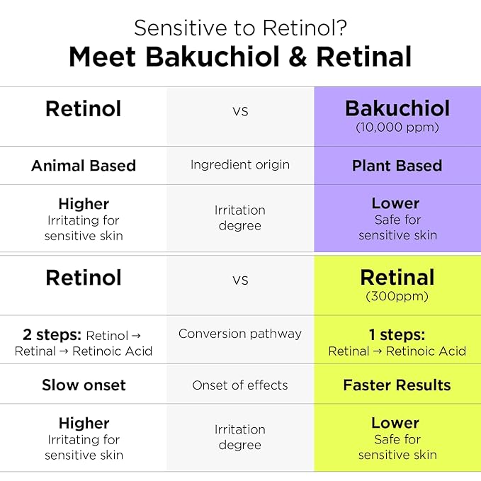 - 🌙NEXT-GEN RETINOL: Formulated with two next-gen retinol alternatives, Bakuchiol (1%) and Retinal (0.03%). Retinal is the perfect alternative to the irritation of Retinol with a higher activity level. Bakuchiol is a plant-based retinol alternative with fewer side effects and is safer to be used for all skin types, making it easy for beginners. Formulated alongside with Hyaluronic Acid and ceramide, it works during your sleep so you can wake up to a visibly smoother, bouncier skin.