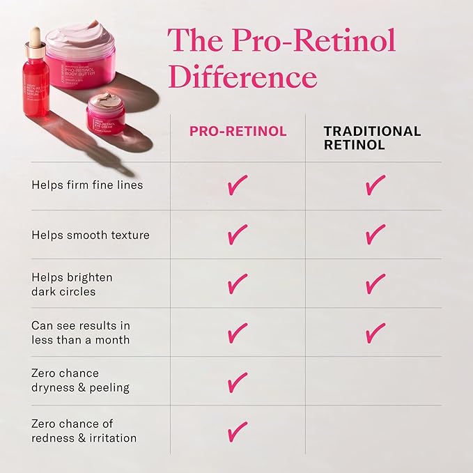 - Pro-Retinol Body Butter - This nourishing air whipped body butter is powered by Pro-Retinol derived from pink algae. This ingredient helps our anti aging cream visibly improve the look of fine lines and wrinkles while smoothing the body without causing flakiness or dryness.