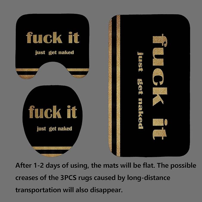 4PCS Gold Glitter Get Naked Shower Curtain Set, Funny Quote Stripe Luxury Glam Modern Dorm Bathroom Decor, Waterproof Fabric Black Shower Curtain, Non-Slip Bath Mat Toilet Rug, Just Get Naked