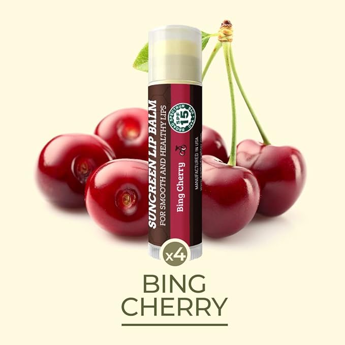 - 4 PACK of SPF 15 SUNSCREEN LIP BALM โ Delicious Cherry Flavor. Everyone loves our cherry lip balm with SPF 15 sun protection, organic beeswax, organic coconut oil and other premium organic hydrating ingredients to protect and moisturize all day long. Our lip balm is great for everyday protection and safe for the whole family