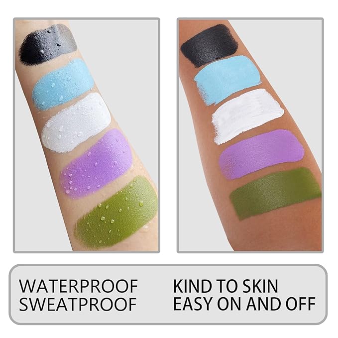 - ✔Professional Clown Halloween Skull Zombie Skeleton Makeup Face Paint --- 1.06Oz/30g for our face paint,meet your need for Clown Skull Skeleton Makeup with full coverage.It infused with waterproof and sweatproof formula,don't come off with sweat and rain.The nice consistency makes it blend into the skin easily with a brush, sponge or finger.It may need some time to dry.To avoid smearing when put on,we advise use the setting powder or setting spray before applying the face body paint