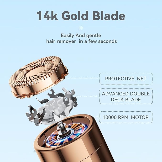 - [Painless Women's Facial Hair Removal] This hair removal device perfectly fits the contours of our body, gently gliding over skin to trim hair off. Facial hair remover features 14k gold plating rounded low-friction protection heads for a smooth complexion without stubble, nicks or redness.