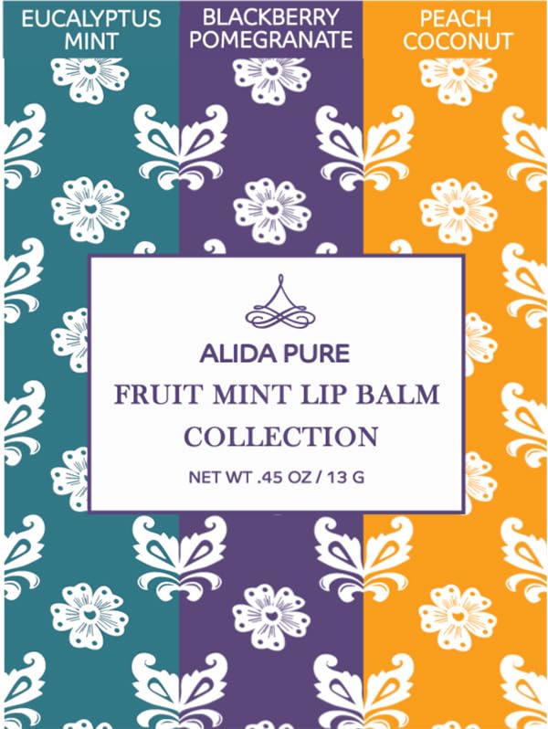 - ALIDA PURE Fruit Mint Lip Balm Collection, is made with cruelty free, hypoallergenic, organic, and natural oils, that protect, and soothe. The delicious, soothing, and moisturizing, Fruit Mint Lip Balm Collection, includes one tube each of Eucalyptus Mint, Blackberry Pomegranate, and Peach Coconut .15-ounce, lip balm tubes. Thoughtfully packaged with bidegradable materials that support the environment.