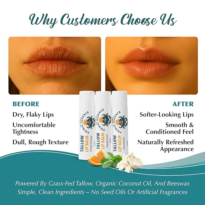 - All Natural Formula: Made without seed oils or artificial fragrances, our tallow lip balms provide simple, effective care with a thoughtfully selected blend