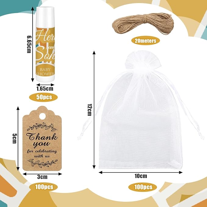 Demissle 50 Pcs Baby Shower Lip Balm Gift Set with 100 Pcs Organza Bags Baby Shower Party Favor for Guest Thank You Tag Rope Baby Shower Party Decoration Gender Reveal Souvenirs(Colorful Stripes)