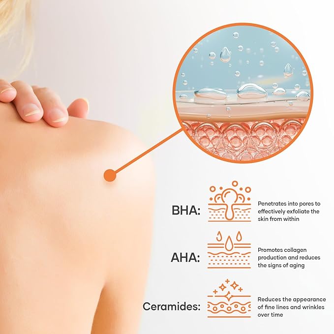 - Exfoliating Body Wash -- Dual Action Exfoliation, combines the power of BHA and AHA, formulated to exfoliate and rejuvenate skin, targeting rough and bumpy skin, keratosis pilaris (KP) and helps acne, body wash salicylic acid for all skin types.