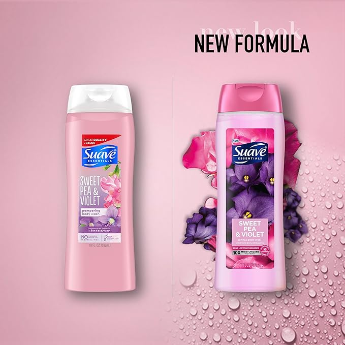 Suave Moisturizing Body Wash, with Sweet Pea Violet and Vitamin E Extract, No Parabens, No Phtahaltes, 18 Fl Oz (Pack of 6)