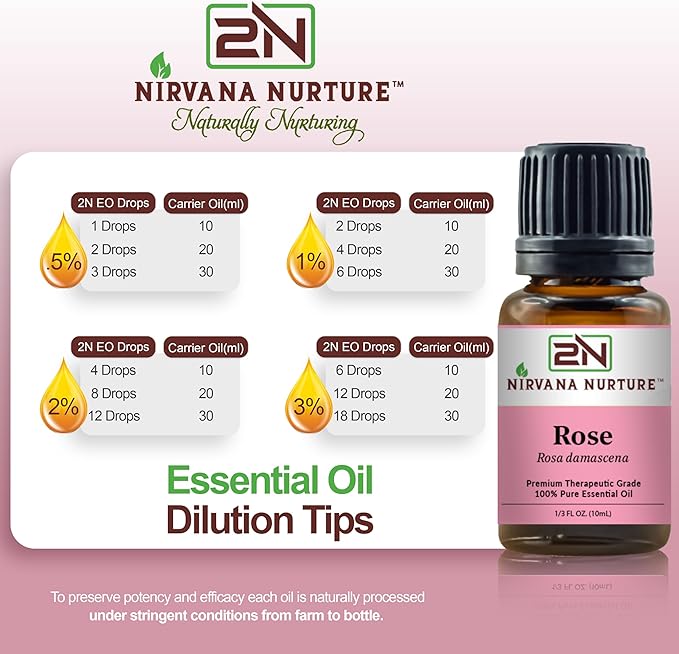 - SKIN BEAUTY: Nirvana Nurture Rose oil has antioxidant properties that help to maintain youthful glow skin and also beneficial in skin moisturizing and producing a rejuvenating effect on the skin. Dilute 5 drops of Rose oil to your choice of carrier oil and apply on your body for benefits.