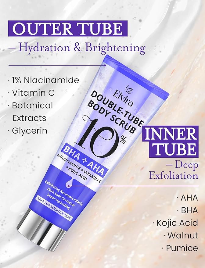 - INNER TUBE - BODY SCRUBBER EXFOLIATOR: Features 10% Salicylic Acid, AHAs, Kojic Acid, Lactobionic Acid, and Lactic Acid to gently remove dead skin cells, clear oil, and smooth texture. Enhanced with Walnut Granules, Pumice Particles, and Natural Silica for deeper cleansing and softness