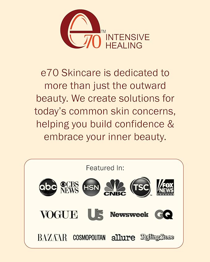- Confidence through Expert Skincare: e70 Skincare for everyone goes beyond outward beauty. We offer targeted solutions for common skin concerns to help you feel confident and embrace your inner radiance.