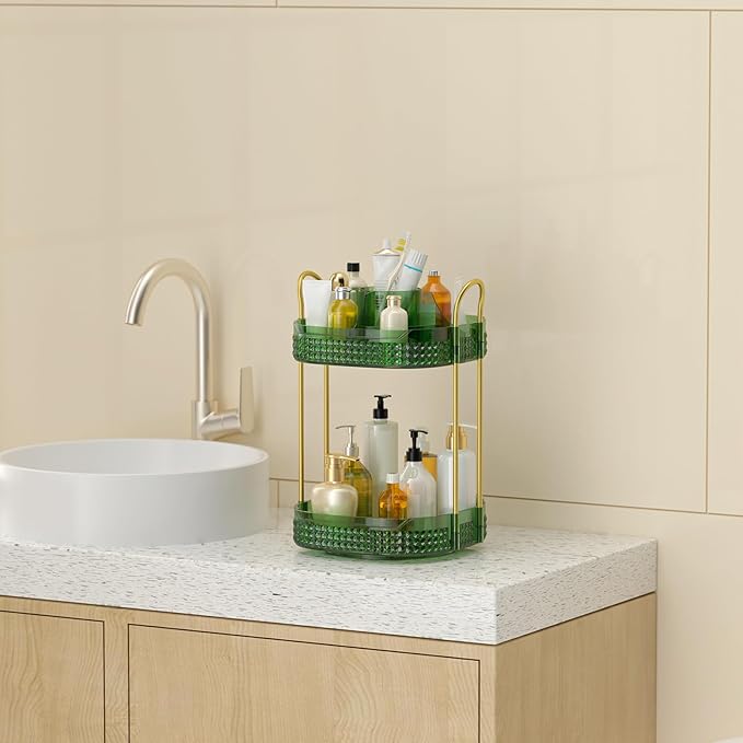 360° Rotating Makeup Organizer 2 Tier, Large Skincare Clear Make Up Storage Spinning Perfume Organizers for Bathroom Counter Dresser, Green