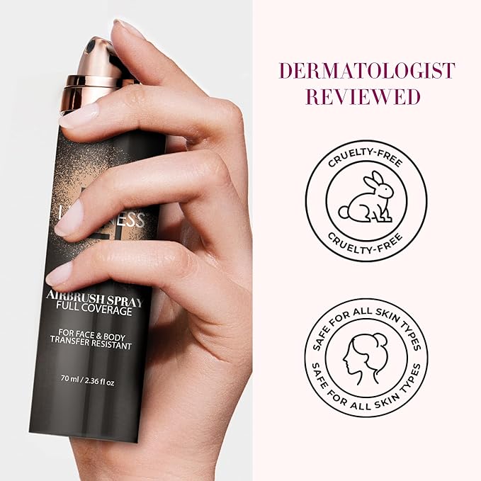- Full Coverage Airbrush Finish: The LUMINESS Airbrush Spray Full Coverage Foundation delivers lightweight, buildable coverage for face and body, effortlessly concealing imperfections and providing a natural, airbrushed finish that lasts all day. 2.36 fl oz. Shade 010