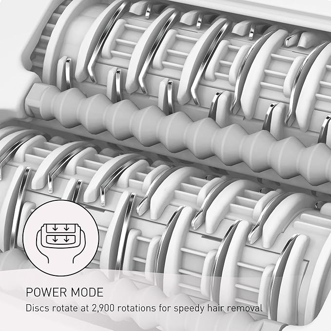 - Smooth, Supple Skin with Less Effort: Dual-disc epilation head has 60 rotating tweezers that open 140% wider than previous model to remove more hair in one pass; reaches hair that waxing can't -as short as 0.02 inches- for smooth, hair free skin