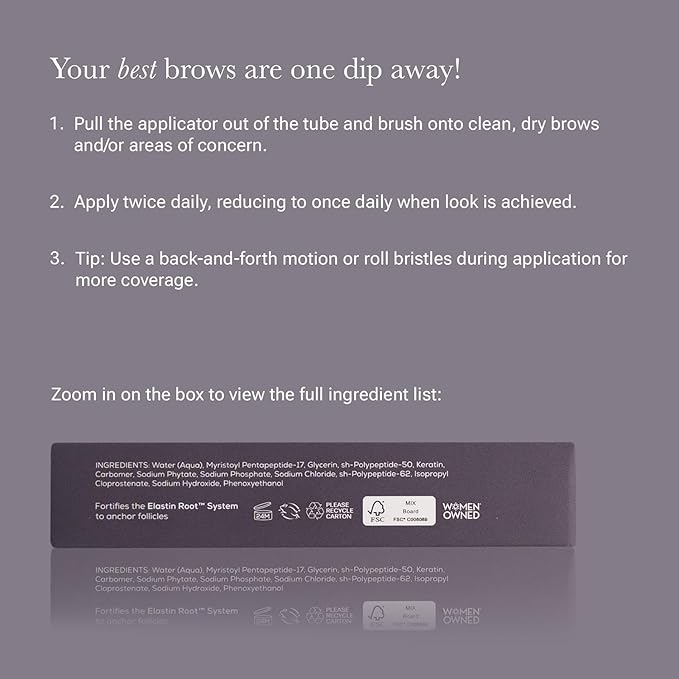 - How to Use - If you want to use this brow serum to promote thicker-looking brows, begin by brushing the formula onto clean, dry brows and skin where results are desired. Use a back-and-forth motion for more coverage. Apply twice daily, and reduce to once when desired look is achieved.