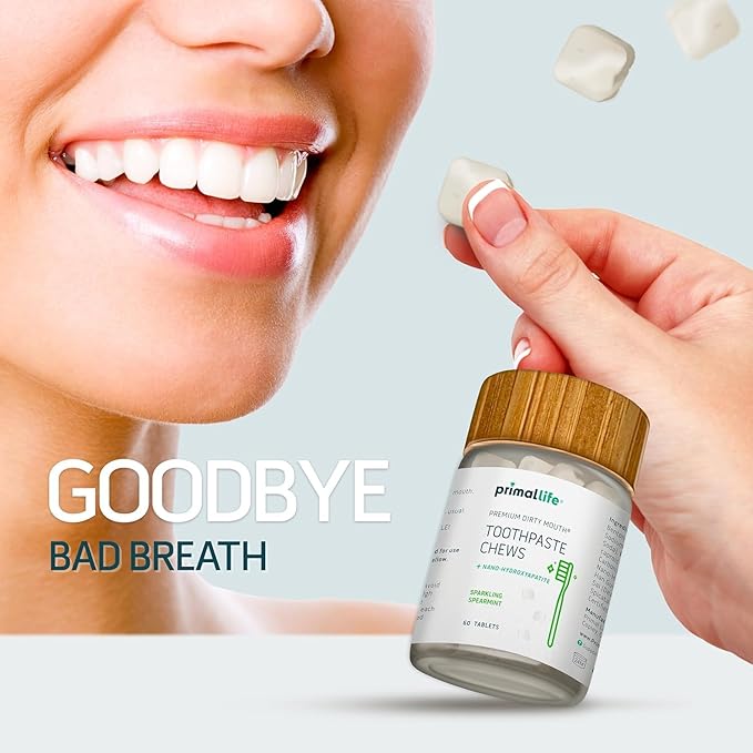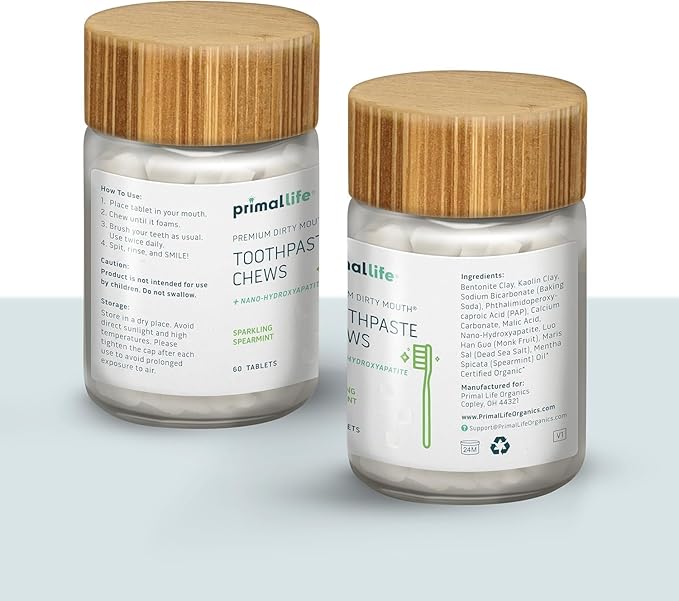Primal Life Organics Premium Dirty Mouth Toothpaste Chews – Nano-Hydroxyapatite Whitening Toothpaste Tablets for Adults - Gluten Free, Vegan, Paleo - 60 Tablets in Jar - Sparkling Spearmint