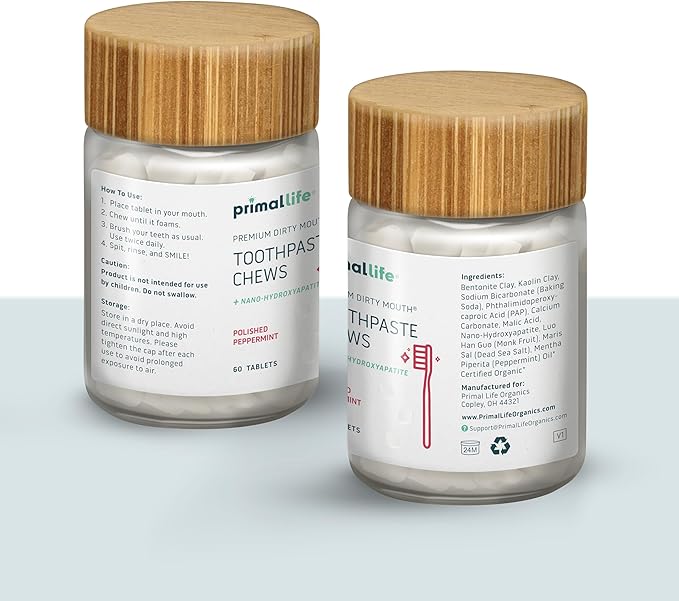 Primal Life Organics Premium Dirty Mouth Toothpaste Chews – Nano-Hydroxyapatite Whitening Toothpaste Tablets for Adults - Gluten Free, Vegan, Paleo - 60 Tablets in Jar - Polished Peppermint