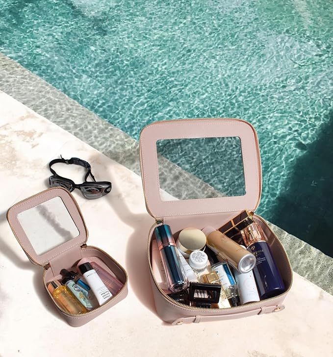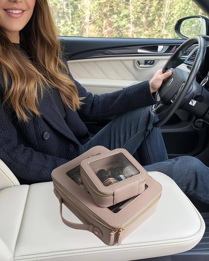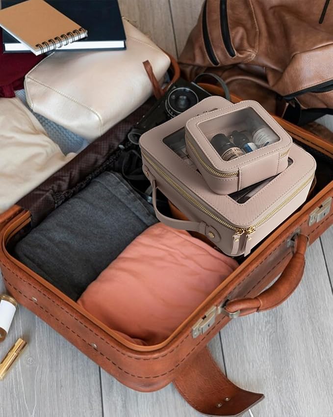 - Clear Design: Our clear toiletry bag set is sleek and minimalistic look for your makeup accessories collection. And is designed with a clear PVC window,all items are clear at a glance, and you can quickly choose the cosmetics you need. Large: 9.44“ x 6.1” x 2.7”, Mini: 5'' x 4.7'' x 2''
