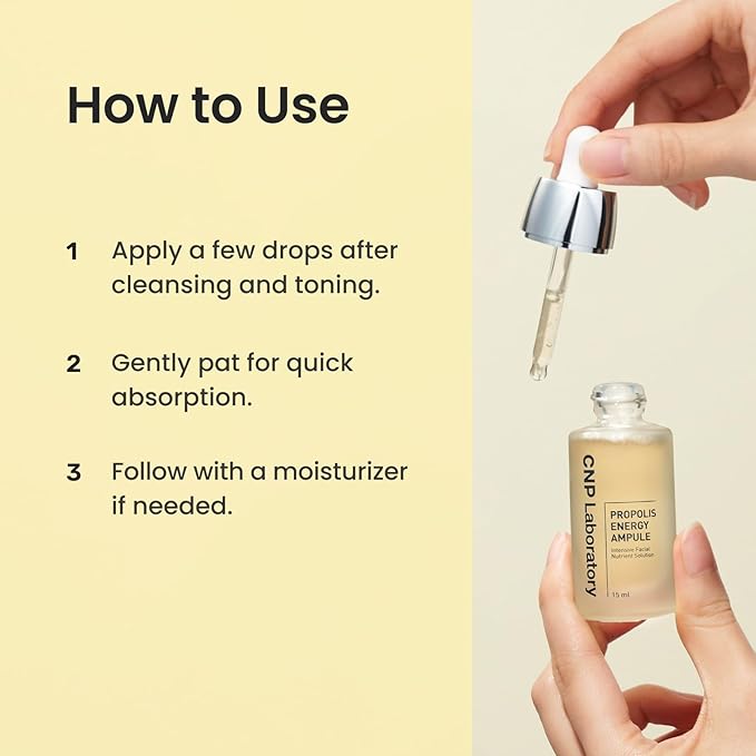 - [PROPOLIS AMPULE] CNP's No.1 steady seller since 2005. It is a facial ampoule infused with two types of propolis extracts, providing deep hydration and a healthy glow to your skin. Comes in a 1.18 fl. oz/ 35ml bottle