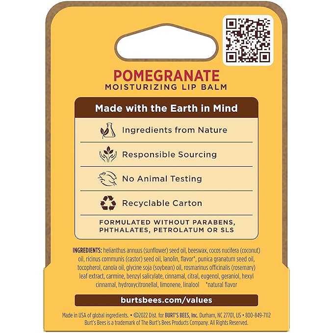 Burt's Bees Lip Balm, Pomegranate, Lip Moisturizer With Responsibly Sourced Beeswax, Tint-Free, Natural Conditioning Treatment, 1 Tube, 0.15 oz.
