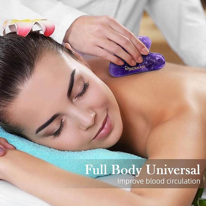 - Excellent Materials: This gua sha massager is handcrafted from 100% naturally Amethyst from South Africa. Amethyst belongs to monocrystalline quartz, which has uneven color distribution and irregular sheet-like shape, usually with a natural ice cracks. It contains trace amounts of Fe element, which can efficiently release negative ions and promote blood circulation, perfect for gua sha massage