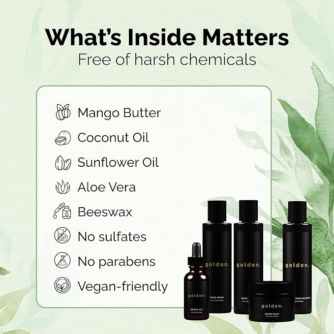 Golden Grooming Co. Everyday Grooming Bundle for Textured Hair & Melanin-Rich Skin | Essential Beard & Skincare Kit with Beard Shampoo, Face Wash, Beard Oil, Body Wash & Beard Balm