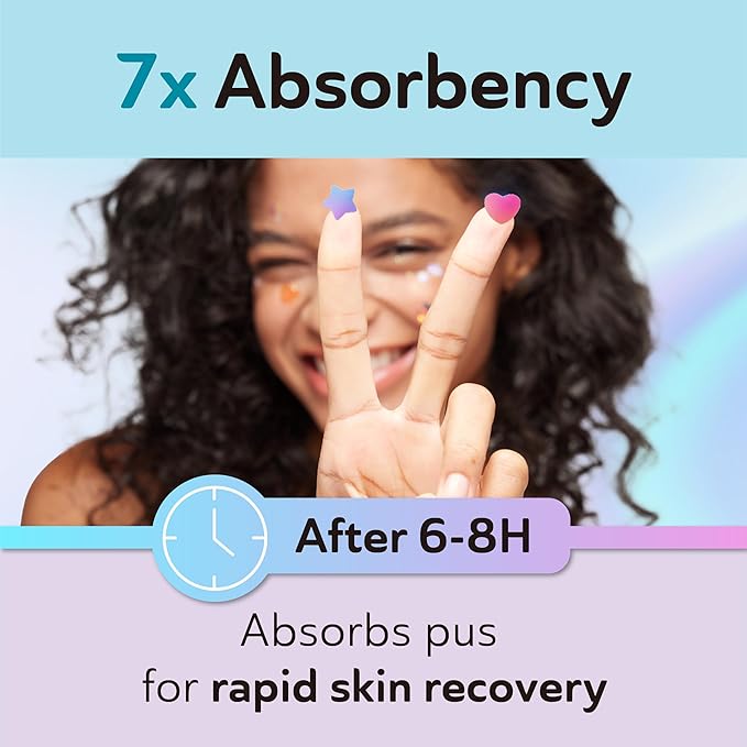 - HIGH ABSORPTION TECHNOLOGY: Experience 7X absorbency that effectively draws out pus and impurities in just 6-8 hours; these hydrocolloid blemish patches create the perfect healing environment by extracting fluid for rapid skin recovery