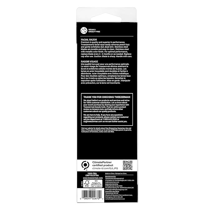 - Premium in quality and superior in performance, now available in Tea Rose. Tweezerman's Facial Razor provides easy removal of peach fuzz while gently exfoliating skin. Designed to be reusable with refillable blades & high-quality stainless steel.
