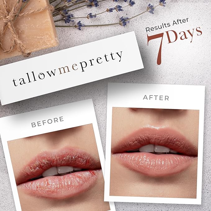 - Round-the-Clock Care: Experience the ultimate in lip care with Tallow Me Pretty’s lip balms; They glide on effortlessly, providing instant relief for chapped lips while forming a protective barrier that shields against peeling, cracking and inflammation