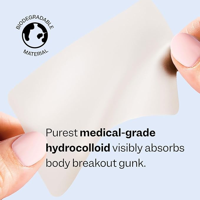 - Medical-grade hydrocolloid gently absorbs body breakout gunk, prevents picking, and creates a healing barrier