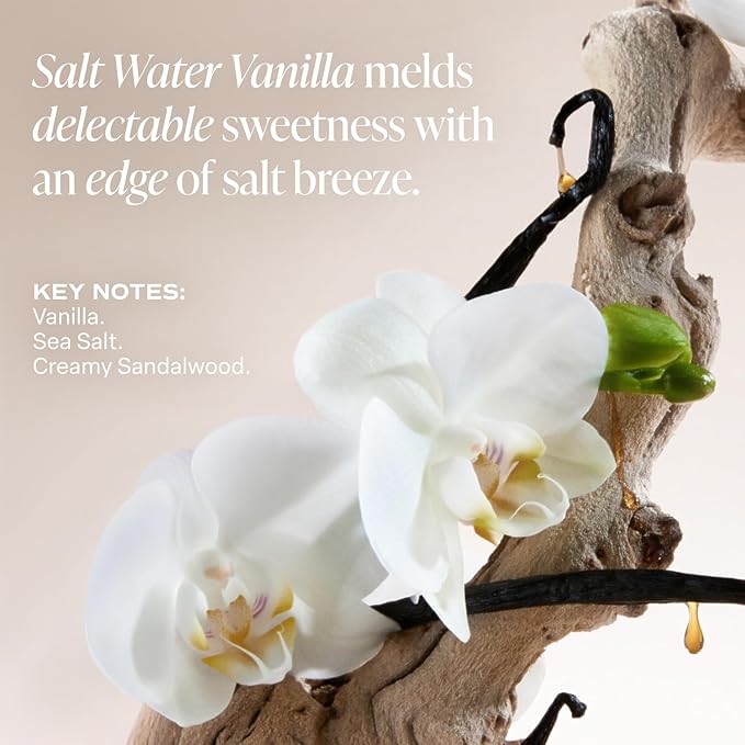 - SALT WATER VANILLA FRAGRANCE: Vanilla, Creamy Sandalwood, and Sea Salt create a luxuriously smooth yet refreshingly airy blend, evoking the sensation of warm coastal breezes and velvety woods. Salt Water Vanilla is warm and enveloping, yet comforting and sweet.