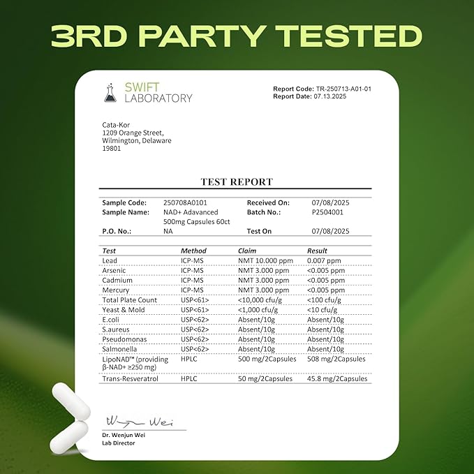 - Third-Party Tested in the USA – Our NAD+ and Resveratrol supplement is rigorously tested by Alkemist Labs for purity and potency. Made in USA from Globally Sourced Ingredients & Components, with a certificate of analysis available upon request.