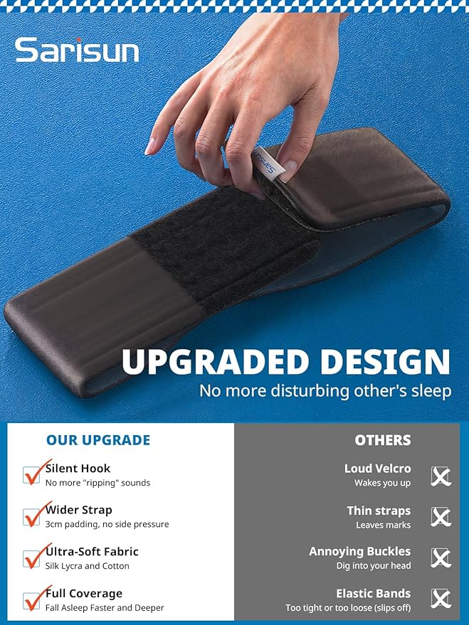 - SARISUN Patented Sleep Mask – Engineered for Deeper, More Restful Sleep: Its wraparound ergonomic design effectively blocks out light from all directions—no eye pressure, no gaps, just pure darkness to help you fall asleep faster and stay asleep longer.