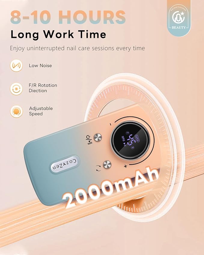 - 【8-10 Hours Long Work Time】Enjoy uninterrupted nail care sessions with our rechargeable nail drill, offering an impressive 8-10 hours of continuous operation on a single charge. Ideal for busy salon environments or long at-home nail treatments, ensuring consistent, reliable performance every time.